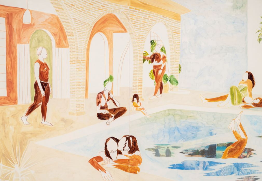 가장 인상 깊었던 것은 바로 추상과 구상의 경계를 넘나드는 그녀의 독특한 화풍이다. 그녀는 인물의 구체적인 묘사보다는 곡선과 색채, 여백을 통해 감정을 전달한다. 얼굴이 생략된 인물들은 오히려 더 많은 이야기를 품고 있으며, 관람객들의 상상 속에서 표정을 얻는 것 같았다. 특히 욕실이나 수영장 같은 친밀한 공간에서 서로 기대거나 쉬는 여성들의 모습은 평온하면서도 강렬한 인상을 남겼다.